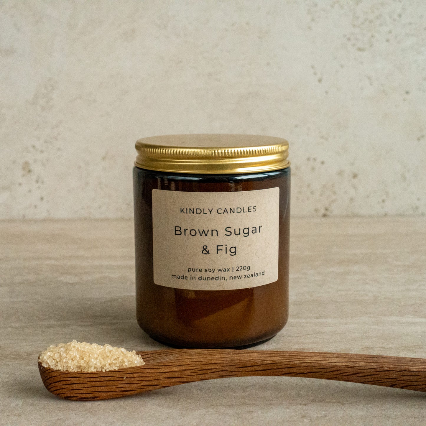 Indulge in the warm, delicious fragrance of our Brown Sugar & Fig soy candle. Fig and brown sugar boasts rich vanilla notes creating a decadent and cozy atmosphere to any space. Treat yourself to a luxurious experience with this exclusive candle by Kindly Candles in Dunedin.